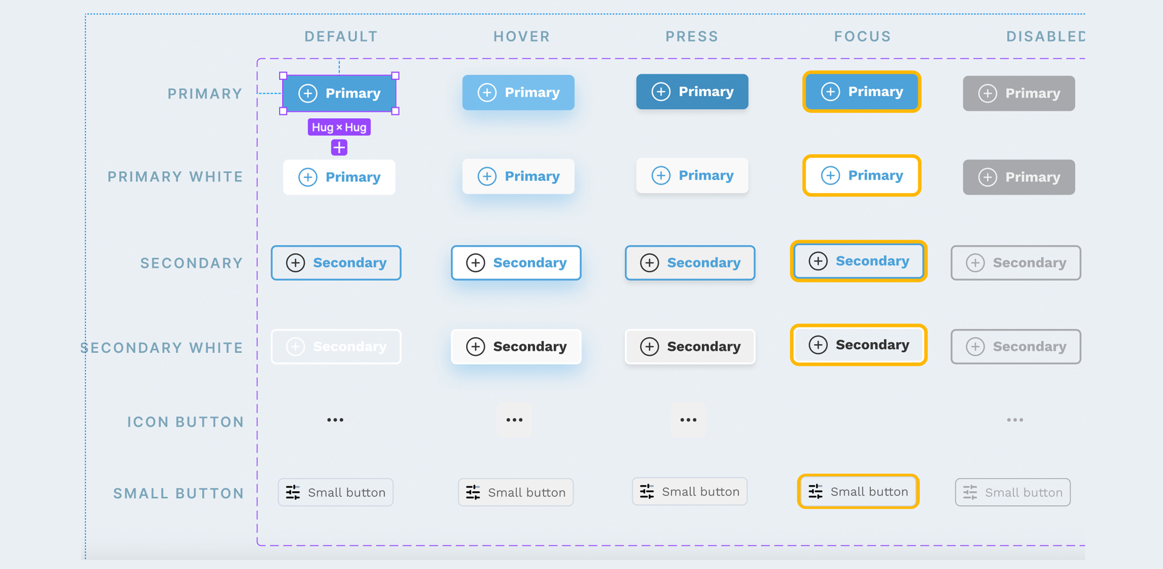 During the build phase, the design system underwent continuous evolution as it can be challenging to anticipate how components will perform once implemented. A notable example of this was observed with buttons. Initially, the "Hover" state of the buttons included a drop shadow effect, which unfortunately became indistinguishable on blue backgrounds due to their similar color. Consequently, I had to reconsider the foundational component and make necessary adjustments. As a best practice, it is always preferable to modify the main component to function effectively on all backgrounds rather than creating additional variations for specific cases. Here is an image showcasing the button set prior to these modifications: